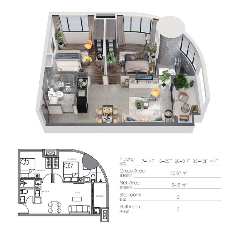 This 2-bedroom condo is beautifully spread over a gross area of 72.67 sqm, with a net size of 54.5 sqm. Each unit features two bathrooms, a well-equipped kitchen, a dining area, and an inviting balcony, perfect for taking in the city views.